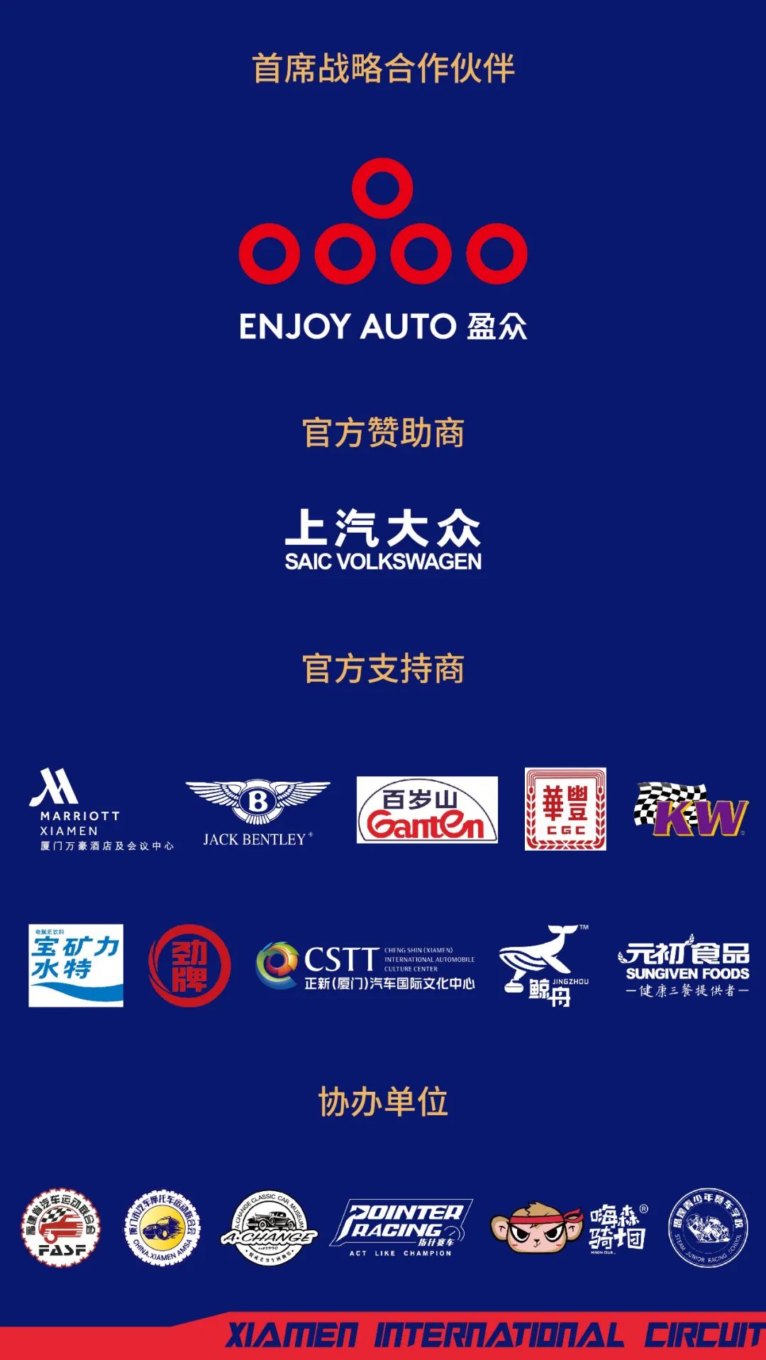 感谢以下赞助商及协办单位给予厦门国际赛车文化节的大力支持,活动延期抱有遗憾,期待再次携手,为广大车迷奉上一场汽车狂欢盛宴。