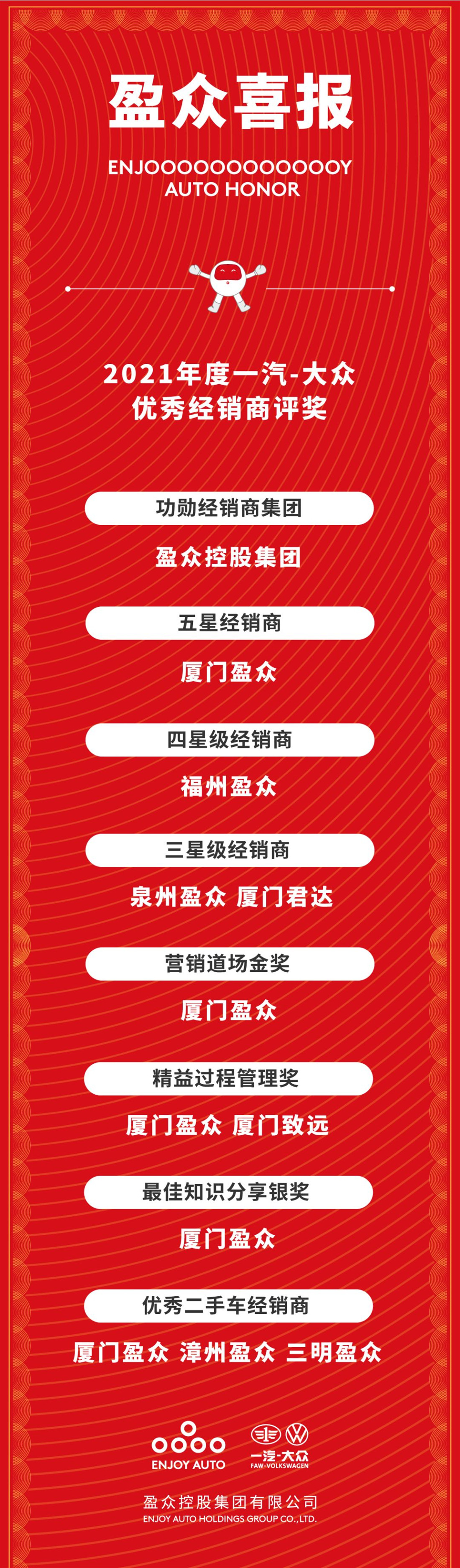 2022年1月,2021年度一汽-大众优秀经销商获奖名单正式出炉。盈众一汽-大众团队以综合实力、品牌影响力、创新营销能力及运营管理能力等多维度的亮眼表现,再度荣获功勋经销商集团、五星经销商等大奖。