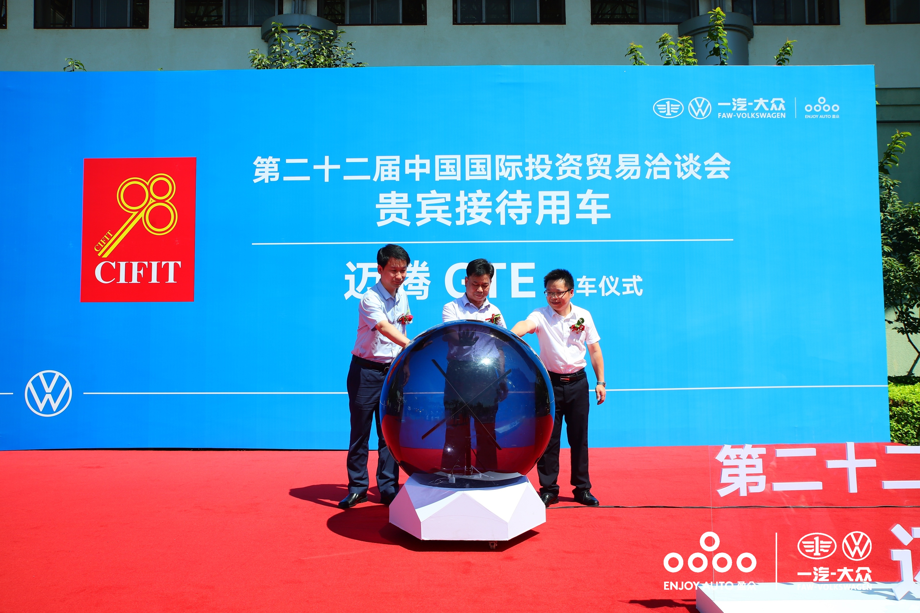 交车仪式上,厦门市机关事务管理局副局长郑端文(中)、一汽-大众福建区域主管销售经理曲慧博(左)、盈众控股集团常务副总裁易远航(右)共同上台点亮一汽-大众迈腾GTE对第二十二届中国国际投资贸易洽谈会的保驾护航之旅。