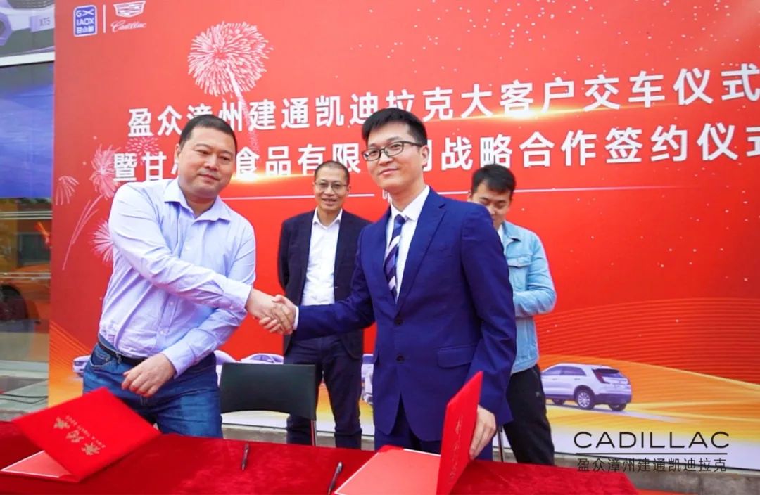 在到场人士的共同见证下,盈众漳州建通凯迪拉克总经理曾蛟龙与甘小鲜(福建)食品有限公司总经理常俊岗签署了战略合作协议,并现场完成首批八台凯迪拉克交车仪式。