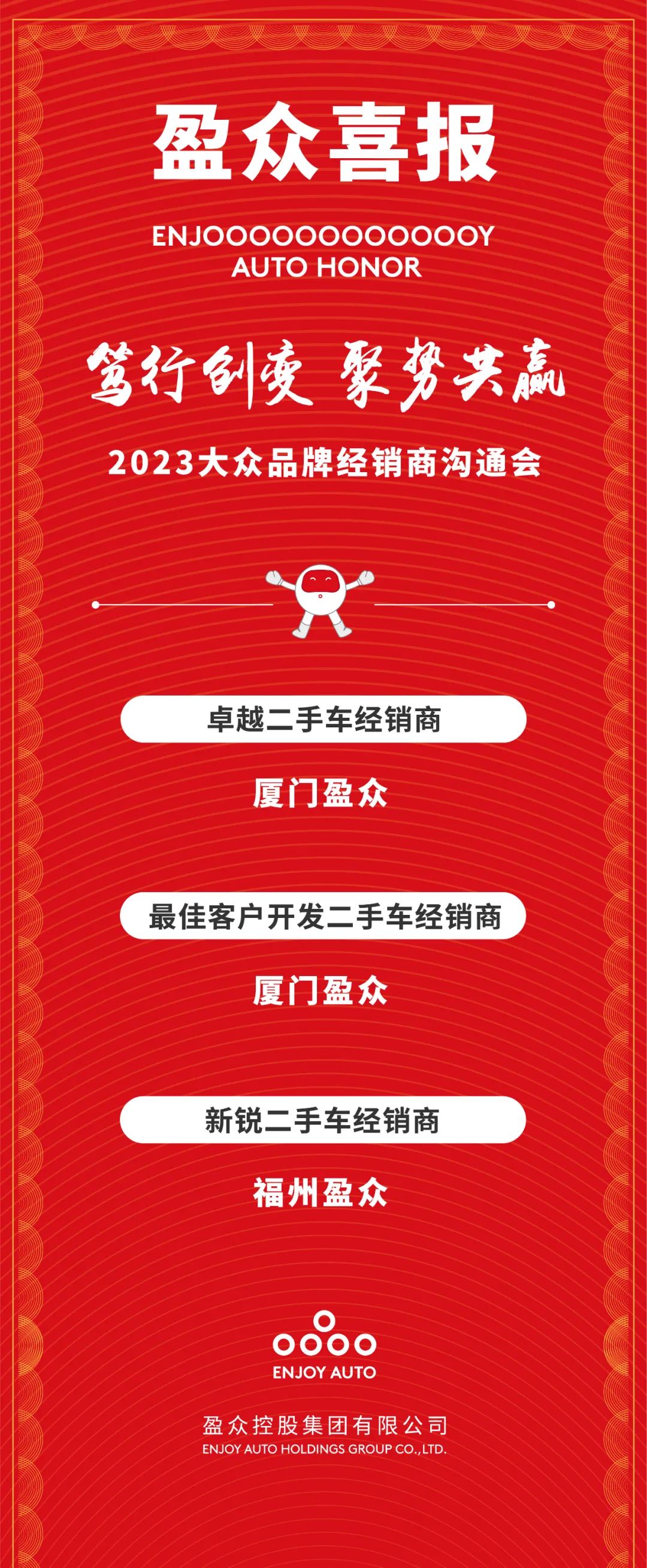 乘风破浪,载誉而归,不忘初心,共启新程。每一份奖项和荣誉,都见证了盈众深耕一汽-大众品牌的积淀和努力,离不开每一位客户、伙伴的认可与信赖,以及全体盈众人的共同奋斗。新的一年,我们将继往开来,再创佳绩,带着过去一年的丰硕成果,共同开启兔年新篇章,“用科技和文化,让人们的汽车生活更美好”!