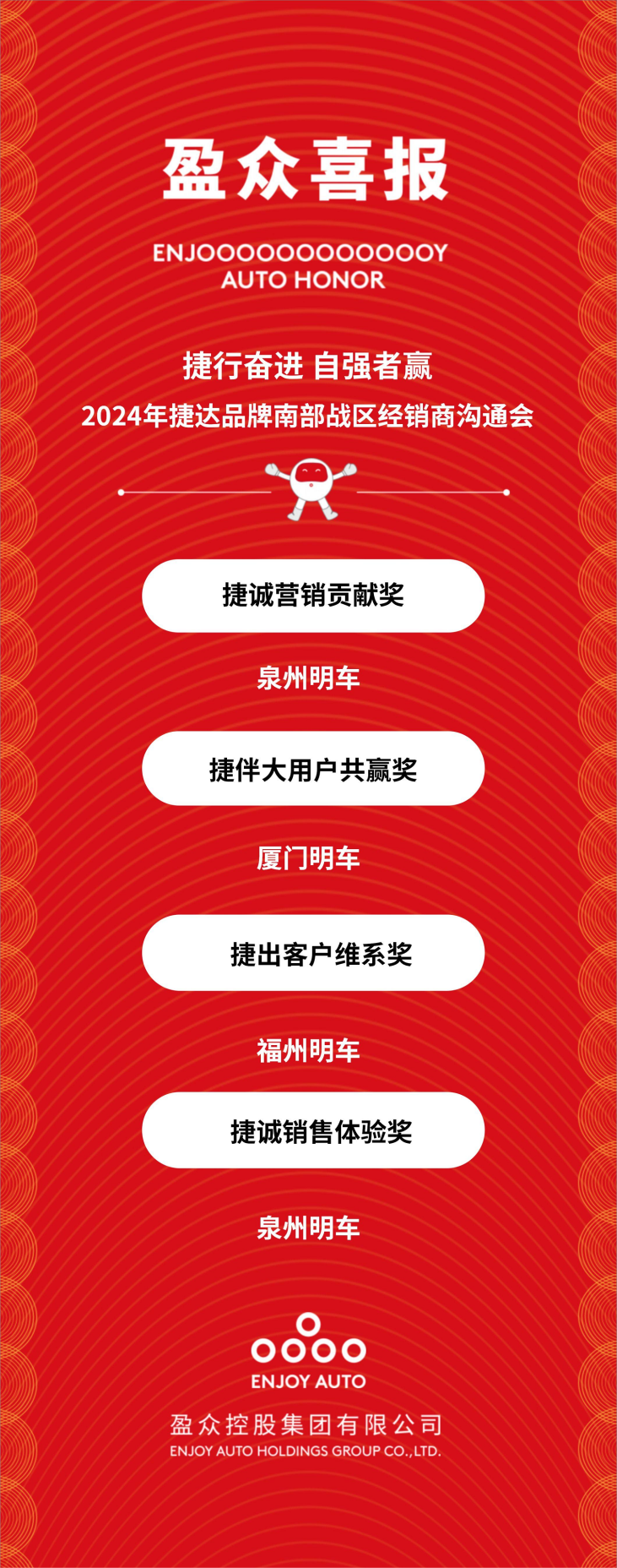喜报 | 盈众荣获捷达品牌多个团队与个人奖项 2024-03-15 盈众控股集团 10902次浏览 3月14日,以“捷行奋进 自强者赢”为主题的2024捷达品牌南部战区经销商沟通会在海口举办。盈众捷达团队凭借2023年在销售业绩、市场表现、运营管理、大用户拓展等方面的出色表现,荣获“捷诚营销贡献奖”“捷伴大用户共赢奖”“捷出客户维系奖”“捷诚销售体验奖”四个团队奖项。 此次经销商沟通会还对优秀个人进行了隆重的表彰,以榜样的力量激励广大经销商伙伴。盈众捷达团队多个业务岗位的多名优秀员工也获得了个人奖项。 2024年,面对汽车行业发展新趋势与新变化,盈众捷达团队将继续坚持盈众“诚信立足社会 服务创造未来”的经理理念,以永不言弃的精神和敢于拼搏的魄力,拼下市场,提升份额,为捷达车主提供更好的产品与服务。 点赞 2 上一篇 下一篇