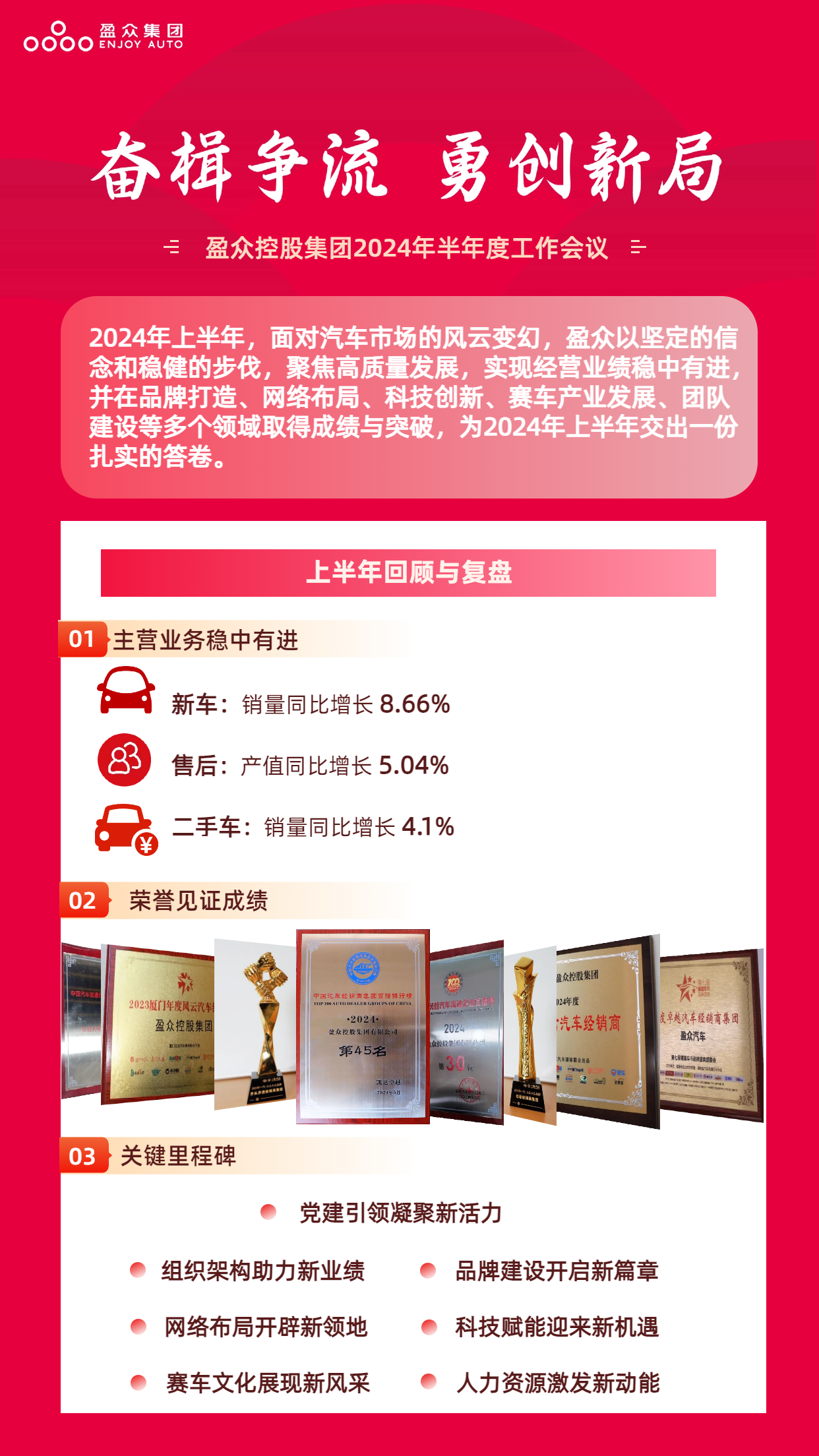 2024年上半年,面对汽车市场的风云变幻,盈众以坚定的信念和稳健的步伐,聚焦高质量发展,实现经营业绩稳中有进,新车、售后、二手车三大主营业务均实现同比增长。同时,在品牌打造、网络布局、科技创新、赛车产业发展、团队建设等多个领域取得成绩与突破,为2024年上半年交出一份扎实的答卷。