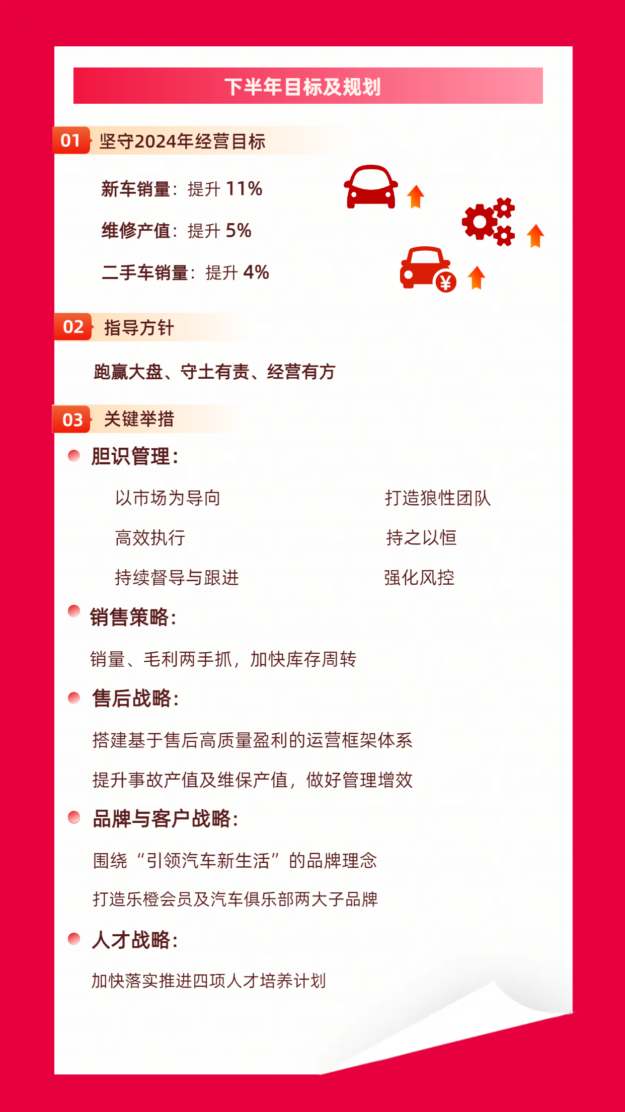 展望下半年,易总再次重申了2024年经营目标,提出“跑赢大盘、守土有责、经营有方”的指导方针,并围绕胆识管理、销售策略、售后策略、售后战略、品牌与客户战略、人才战略提出系列关键举措。