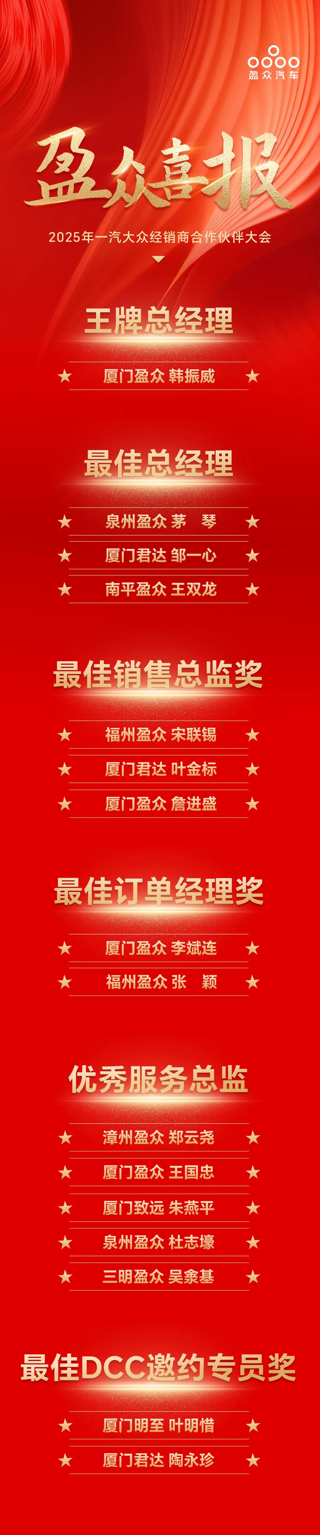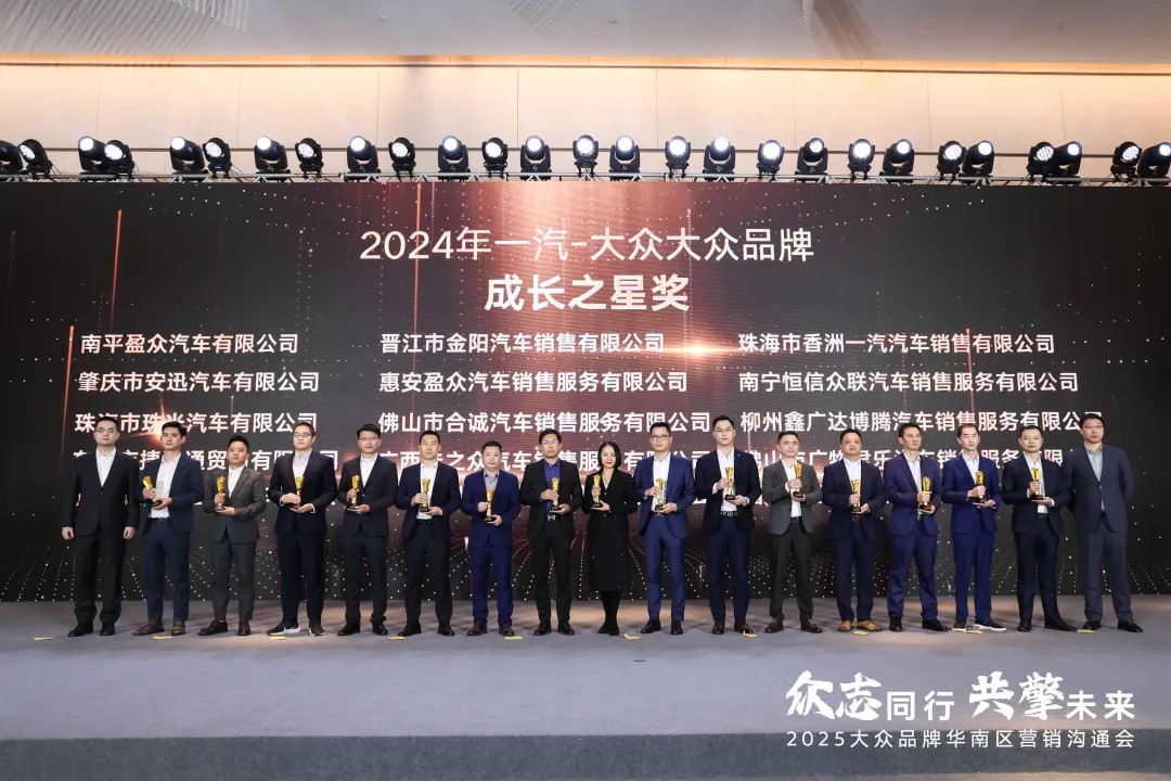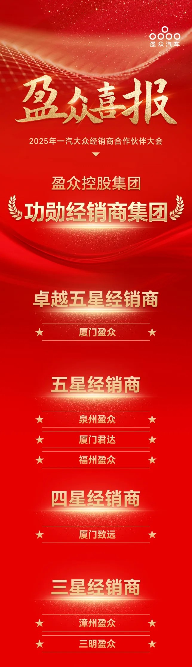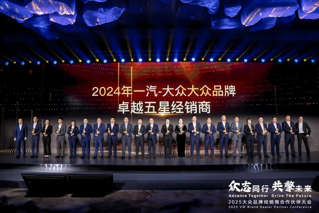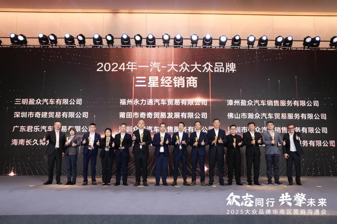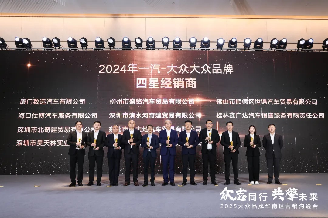 近日,2025大众品牌经销商合作伙伴大会、一汽-大众华南区经销商年会相继召开,2024年度一汽-大众优秀经销商名单及个人获奖名单新鲜出炉。盈众一汽-大众团队凭借过硬的综合实力及销售业绩、运营管理、客户服务体验等多维度的亮眼表现,荣获“功勋经销商集团”“卓越五星经销商”“五星经销商”“王牌总经理”等系列奖项。