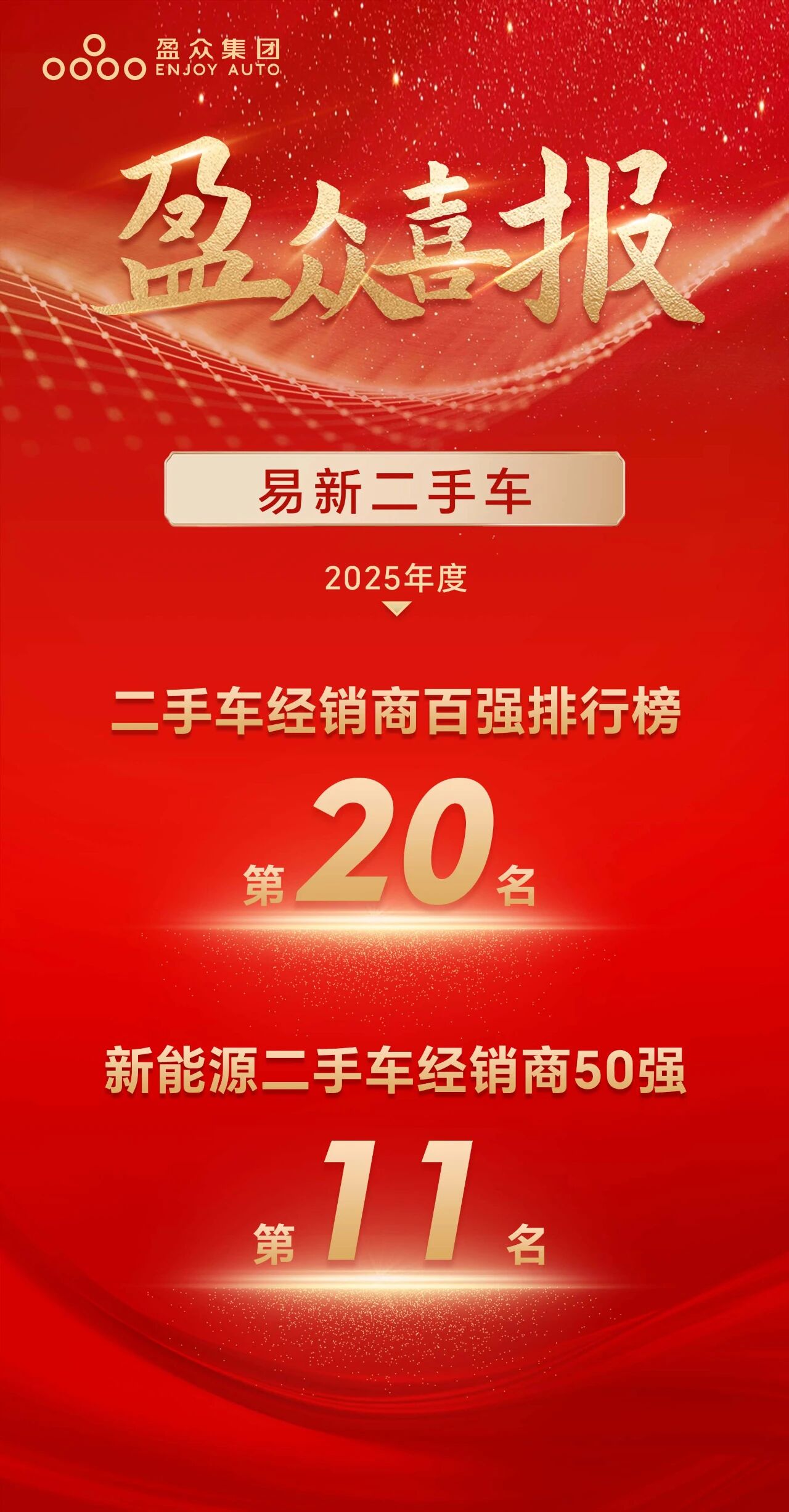 喜报 | 盈众旗下易新二手车荣获“2025年度中国二手车经销商百强排行榜”第20名