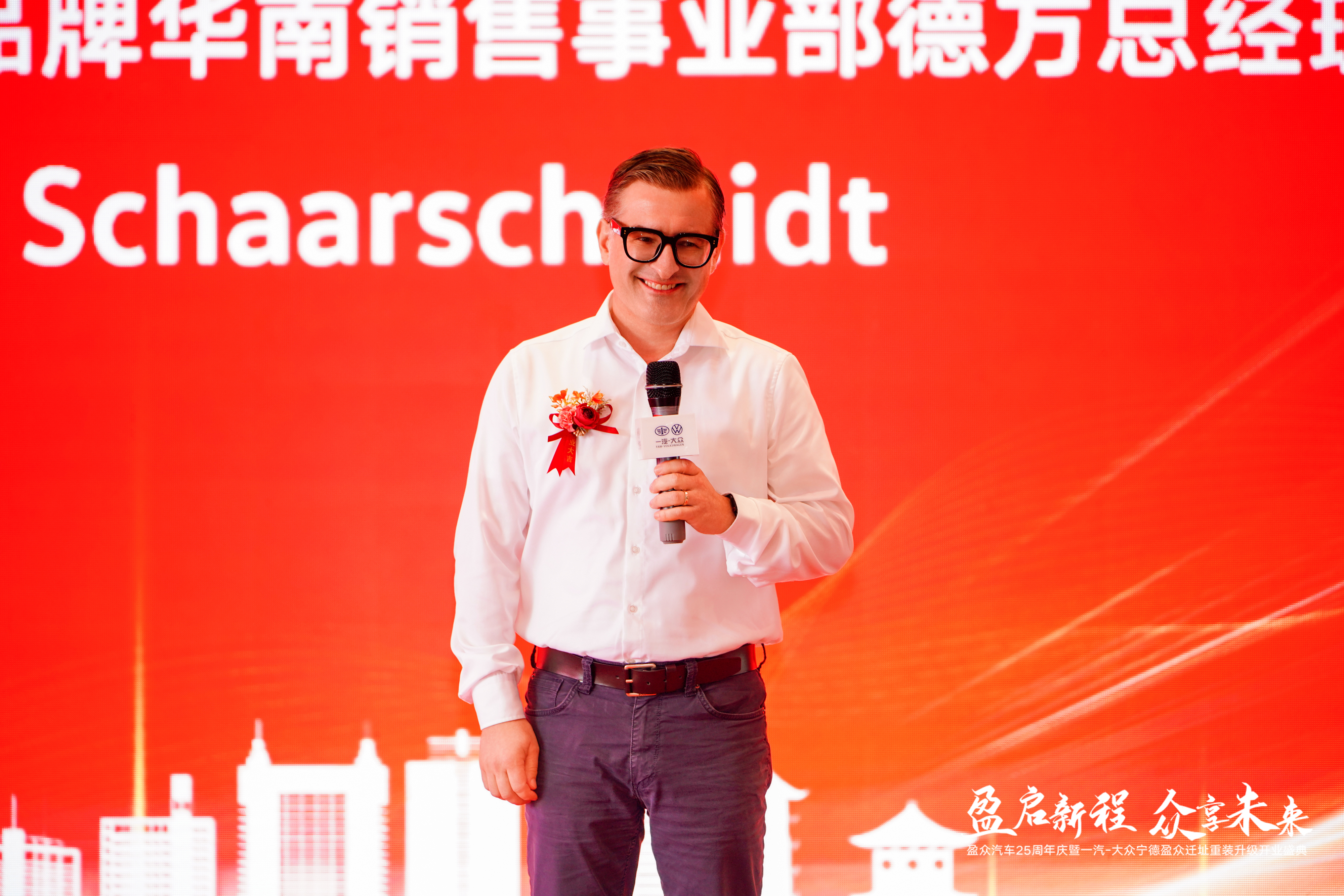 一汽-大众华南区销售事业部德方总经理 Alex Schaarschmidt先生代表厂家致辞。他表示,一汽-大众秉承“以人为本”的理念,致力为用户提供高品质的车辆及用车服务。一汽集团与大众已签署11个新车型项目,包括纯电、插混、燃油车等多种类型。明年计划上市的纯电车型,基于全新电动架构,且专为中国市场研发,希望能为中国消费者带来更环保、更智能、更安全的汽车解决方案。同时,盈众集团作为一汽-大众忠实伙伴,始终在福建市场深耕细作,密切围绕客户需求,不断提升服务水平和服务能力,为一汽-大众积累了良好的品牌价值和市场口碑。宁德盈众此次重装升级,相信在盈众集团和一汽-大众团队的共同努力下,将成为区域内的行业服务标杆,为用户提供卓越的用车服务。