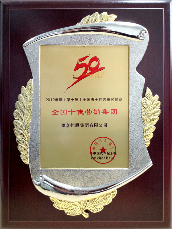 2012年,中国汽车市场增长放缓,汽车产业进入新一轮调整期。作为海西领先的汽车经销商,盈众汽车全体员工,精诚团结,艰苦奋斗,共同应对挑战,以全方位出色的表现获得了行业协会及媒体的认可和表彰,荣膺“全国十佳营销集团”,并荣获多项行业大奖。